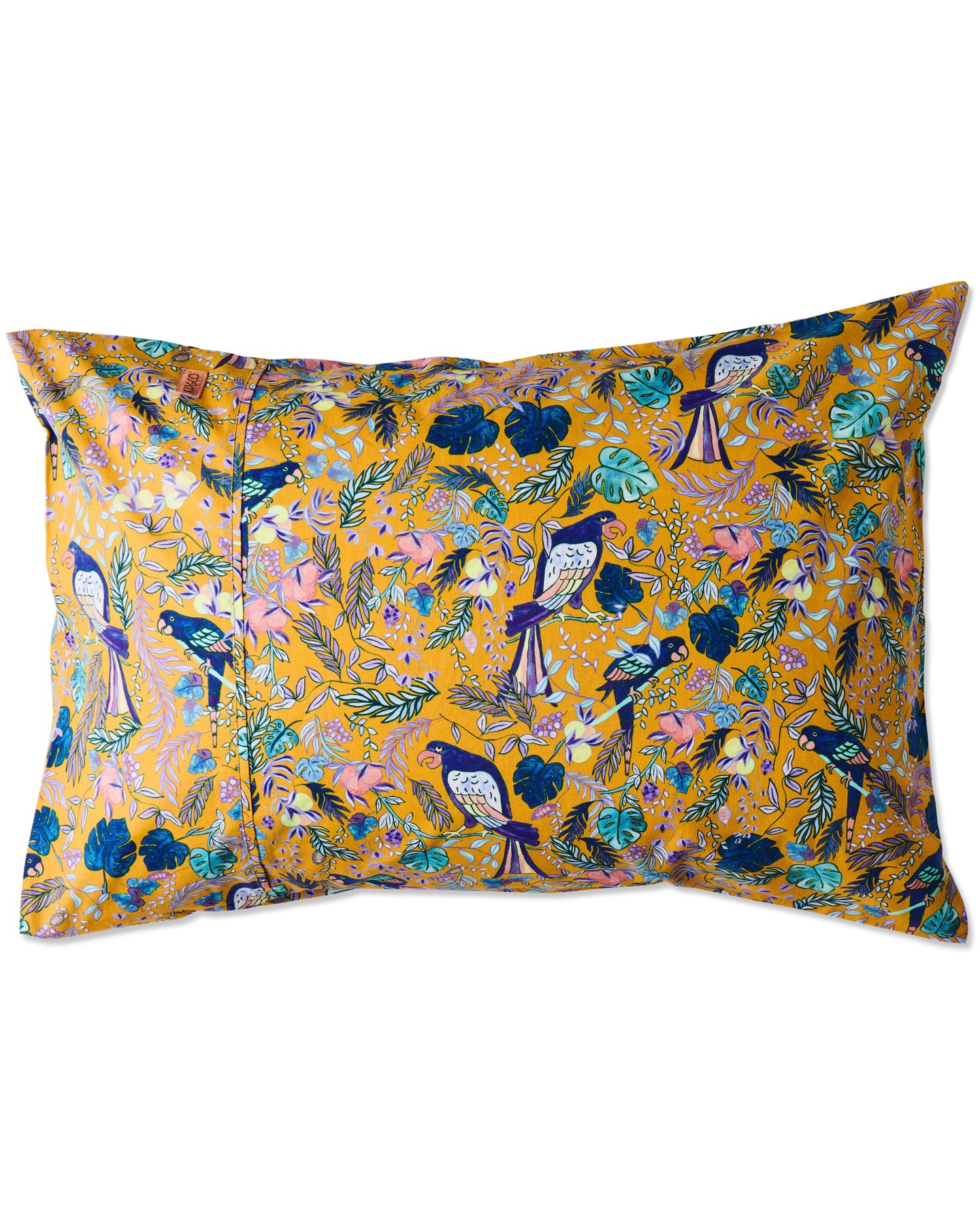 Sleep soundly surrounded by prints that make your heart sing. Embrace the colourful life with our GOTS certified organic cotton printed bedding, full of character and kind to the planet. The Birds Of Paradise Organic Cotton Pillowcases feature a revival Kip&Co print, with flowers, fronds, and parrot friends in jewel tones on a mustard base. Pair with co-ordinating Birds Of Paradise Organic Cotton Quilt Cover, or mix and match with bedding across our linen, velvet and quilted range.