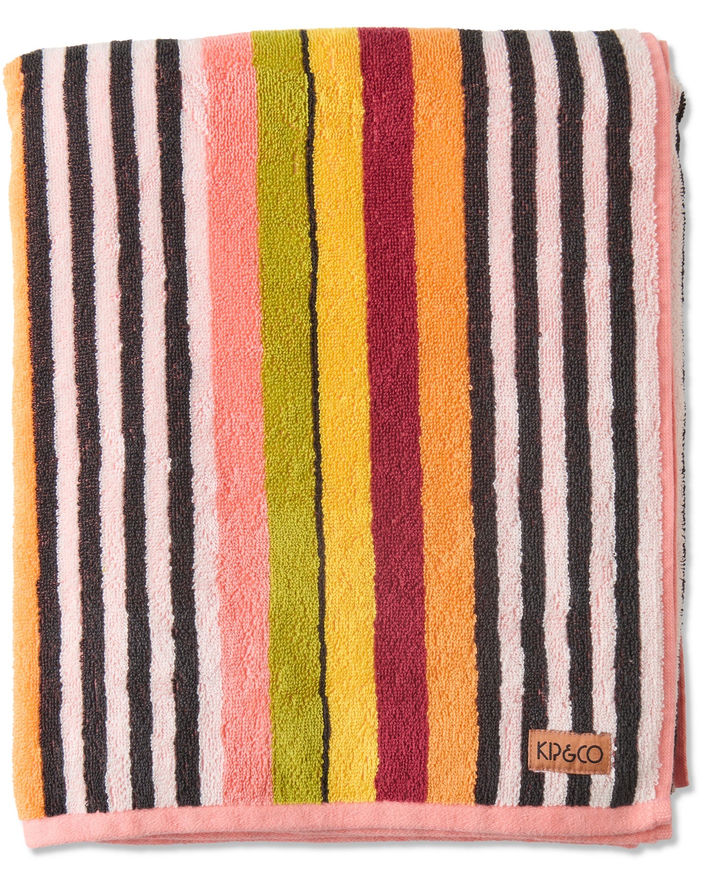 Soak up the sun, salt and some serious leisure time with our plush Casablanca Stripe Terry Beach Towel, your ultimate sidekick for a summer spent chasing waves and stretching out seaside. Soft, absorbent and super sized for full-body lounging, it’s made for sandy toes, salty skin and long, lazy beach days. Whether you're drying off post-dip or claiming your patch of paradise, this towel brings the sunshine vibes wherever it goes. Made from 100% cotton terry featuring a striking striped pattern in black, white, pink, orange, red and mustard green with peach pink woven edge finish.