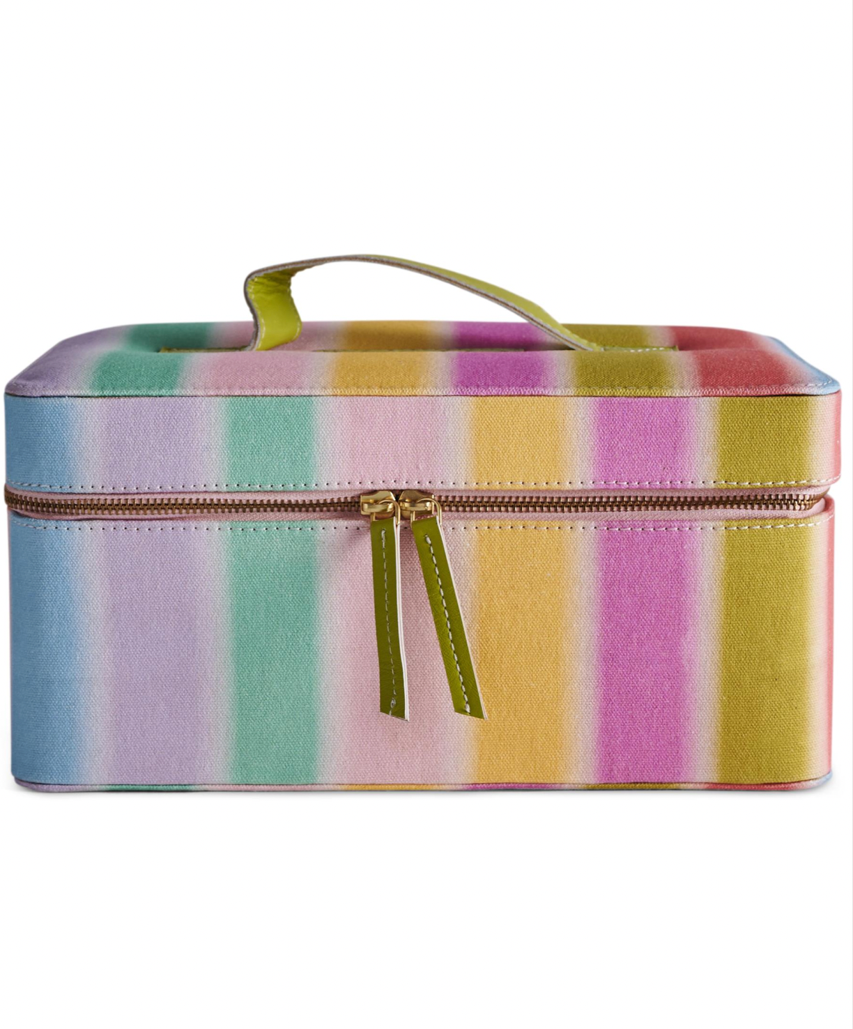 Our signature toiletry case make for the most loyal of travel companions. Made from durable 100% cotton canvas with a sturdy hard-shell structure, this case offers ample space with internal compartments to shield your toiletries and travel essentials from any bumps and bruises. Whether you're jetting off on a weekend getaway or simply need organisational order right at home, this versatile case is perfect for the job. Fashionable and functional this case double up for a bunch of different uses: sewing kit, craft box, beauty case, treasure chest or desktop stationary holder, making it a true all-rounder. The Colour Chameleon Toiletry Case features blurred vertical stripes in a pastel rainbow of colours with citron green leather branding and zip details.