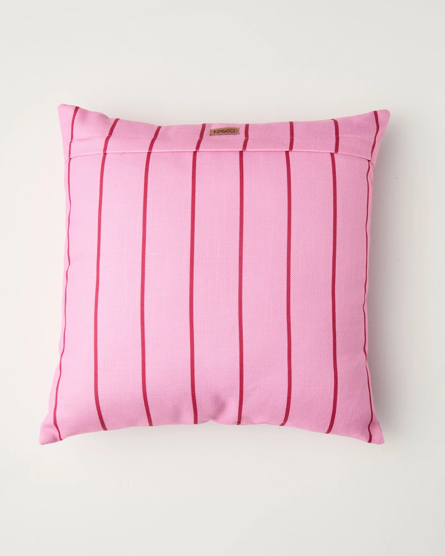 Make yourself at home, outside. Our new Iced VoVo Stripe Outdoor Cushion brings colour, comfort, and a big dose of summer style to your garden, balcony, or backyard hangs. Made from recycled polyester that’s fade and mould resistant, this beauty is built to weather the sunshine season. Kick back, settle in, and let the good times roll from day to dusk. Available in two sizes, and featuring a candy marshmallow pink base and jammy red vertical stripe.