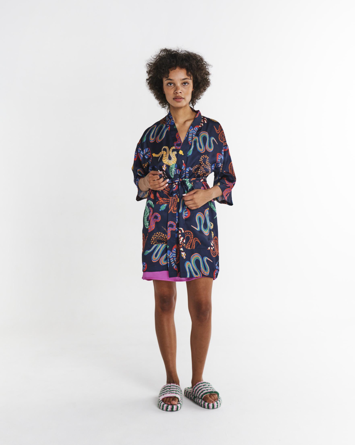Made from lustrous 100% recycled eco polyester satin, the Snake Pit Satin Robe features snakes all over in a multitude of colours and patterns on a black base. Designed to keep you cool and comfortable, the lightweight satin fabric ensures a breezy feel, ideal for balmy summer evenings.