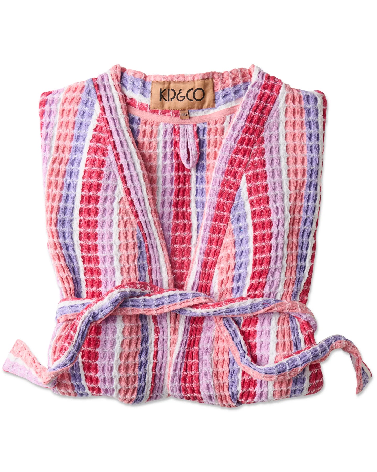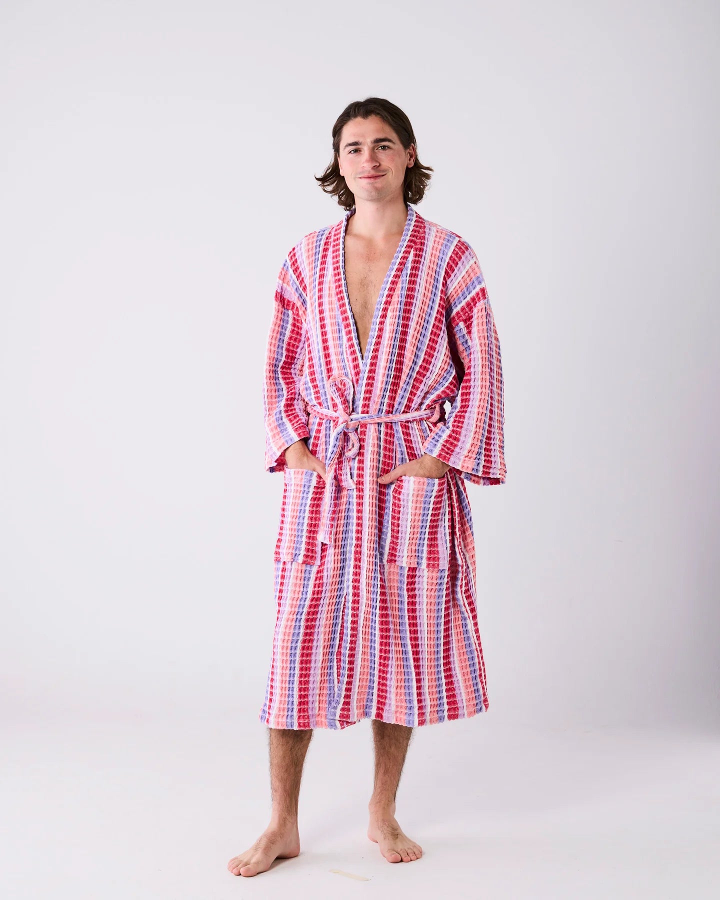 Your everyday holiday starts here! The Sorbet Soiree Waffle Bath Robe is summery, soft, and perfectly textured for wrapping up after a dip or a long, slow morning. With a comfy tie-waist and generous cut in pink, purple, and white stripes, it’s the ultimate at-home getaway piece.