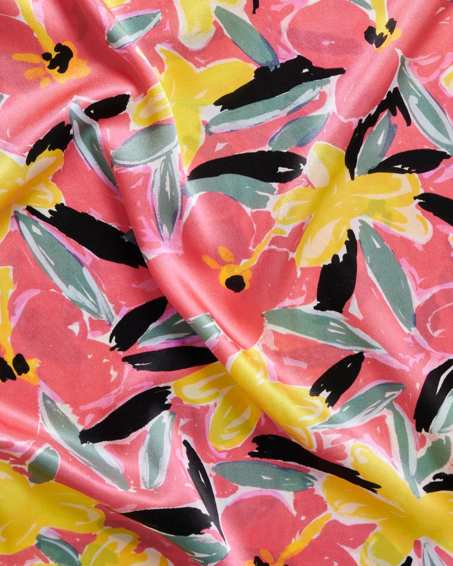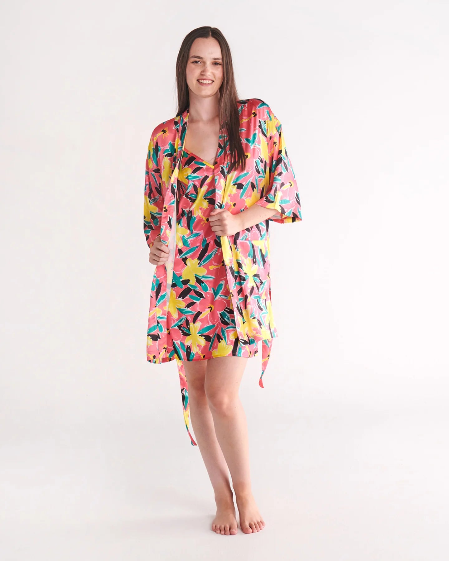 The Kip&Co x Ken Done Pinky Dreaming Satin Robe is a dreamy little number, soft and silky and super lightweight. Made from 100% recycled eco satin, this mini length robe features a flood of tropical florals in beautiful shades of coral pink, buttercup yellow and minty green with black accent leafy details. Wrap yourself in a little Ken Done colour and luxe out in the best of comfort. There's nothing like a little robe time!